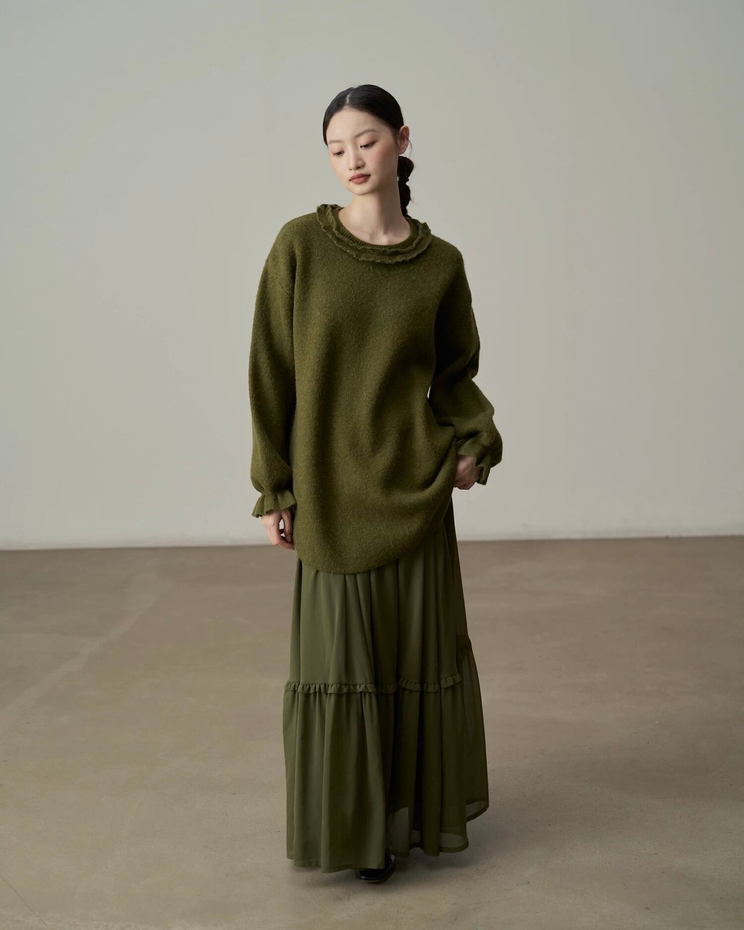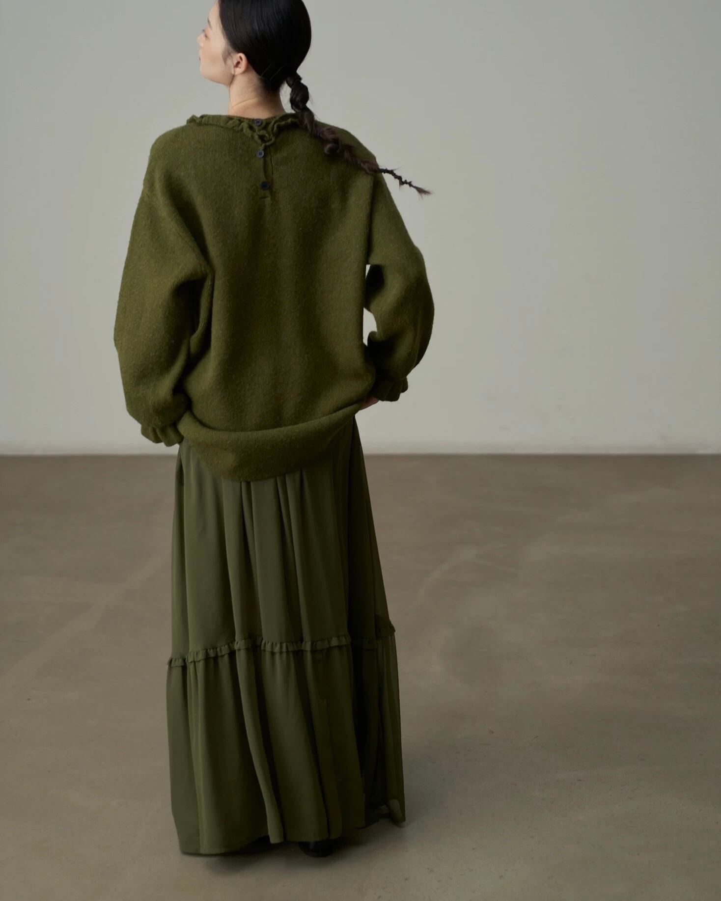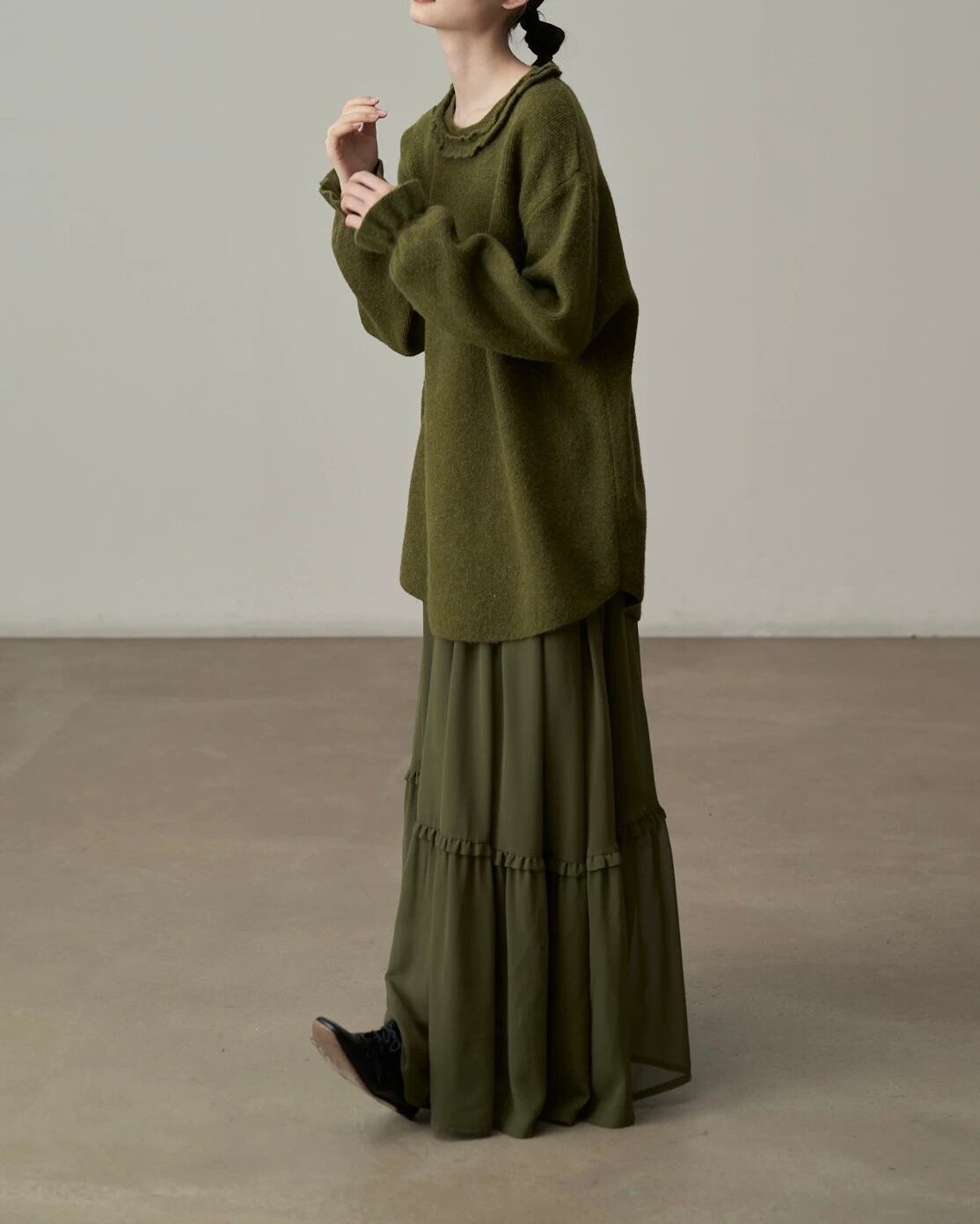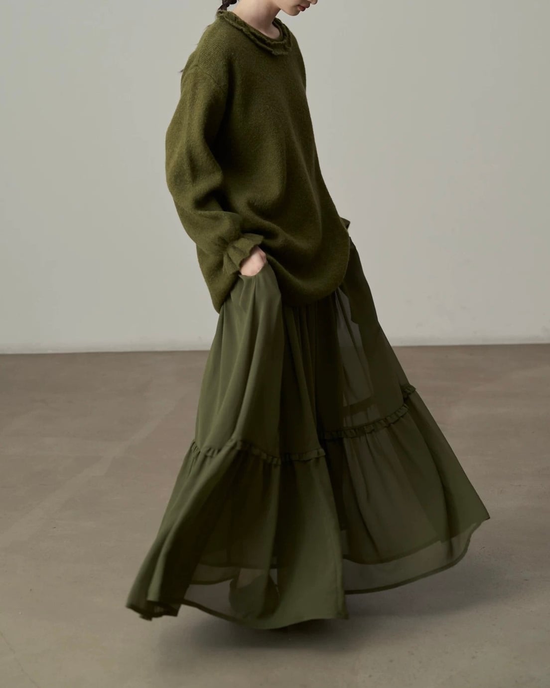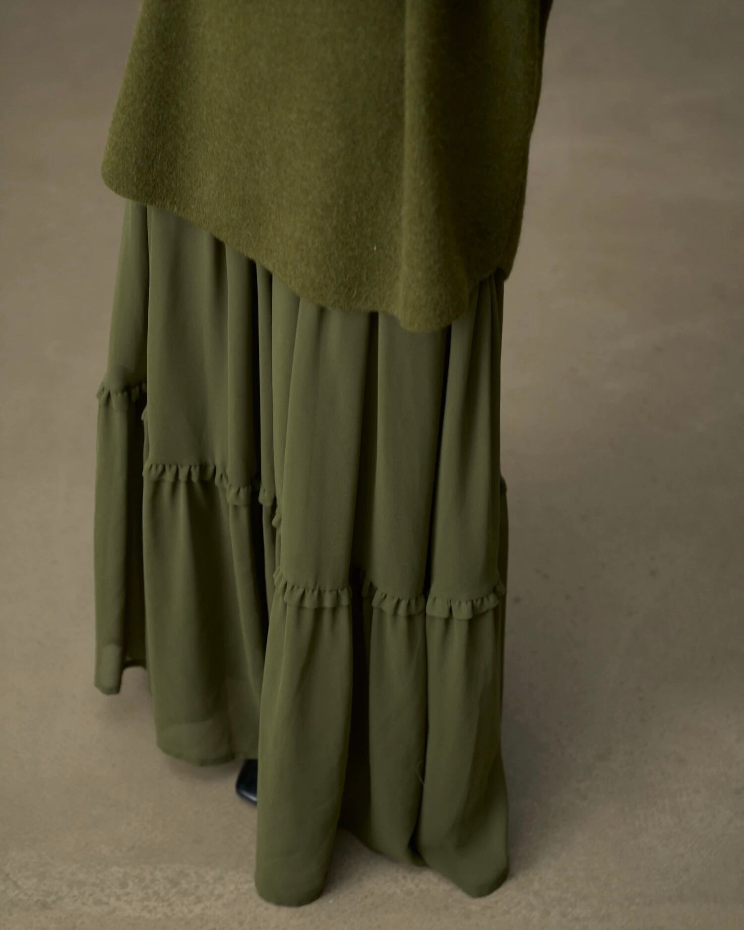 春の装いに欠かせないマストハブアイテム!春先のリラックス感は、流れるようなマキシスカートから。柔らかなドレープとたっぷりとしたワイドヘムが、洗練された雰囲気を演出するミリタリーグリーンのシフォンスカートは、ワードローブに欠かせない定番アイテムです。