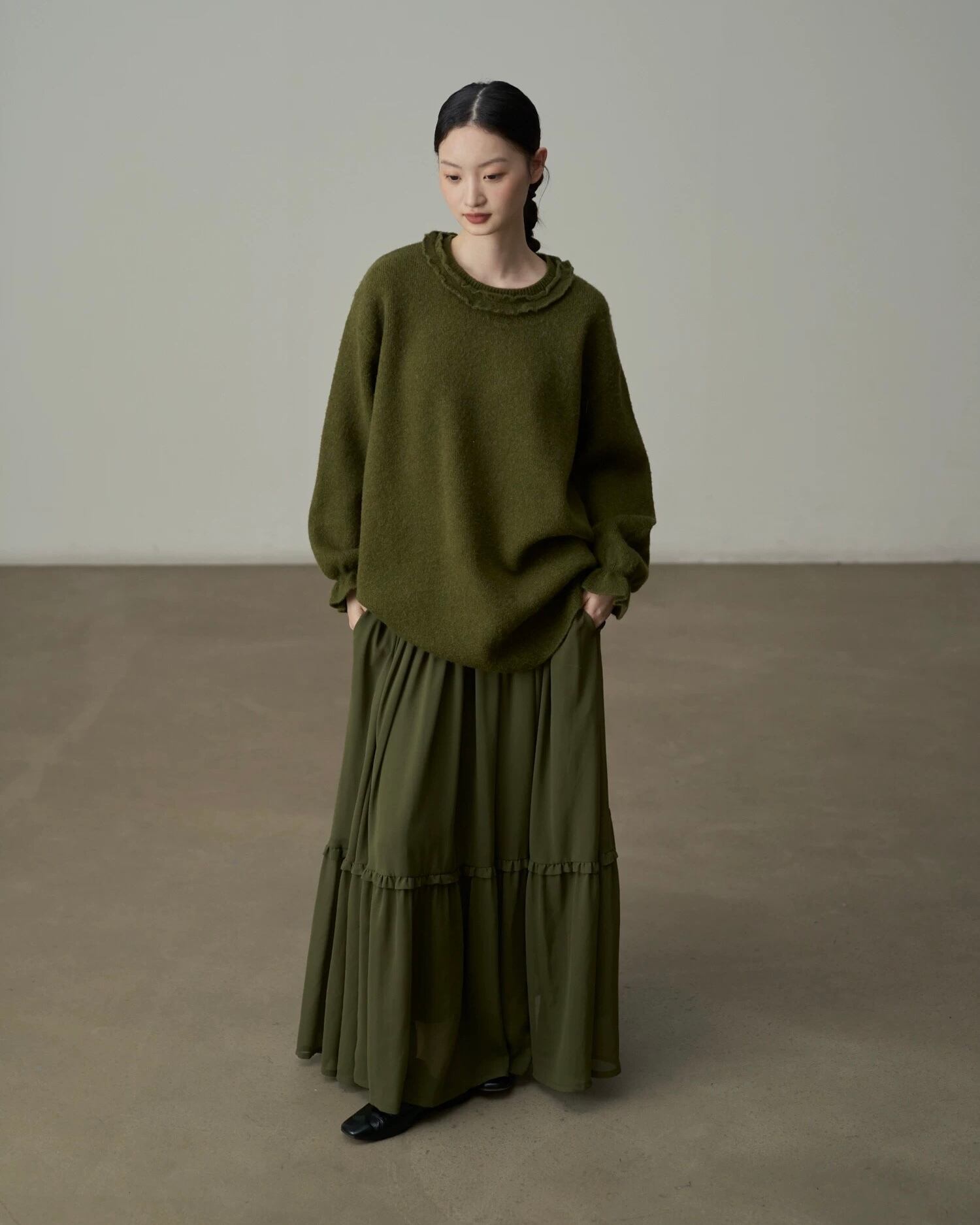 上質なシフォン素材:軽やかで滑らかな質感と優れたドレープ性で、歩くたびに優雅に揺れ動きます。テクスチャードプリーツがリッチな印象と美しいシルエットを演出し、気になるヒップや脚をすっきりとカバーし、脚長効果も発揮。リラックスしたエフォートレスな雰囲気を演出します。ミリタリーグリーンのトーン:彩度を抑えたミリタリーグリーンは、レトロな雰囲気で優しく、春先のワードローブに合わせやすい万能アイテムです。
